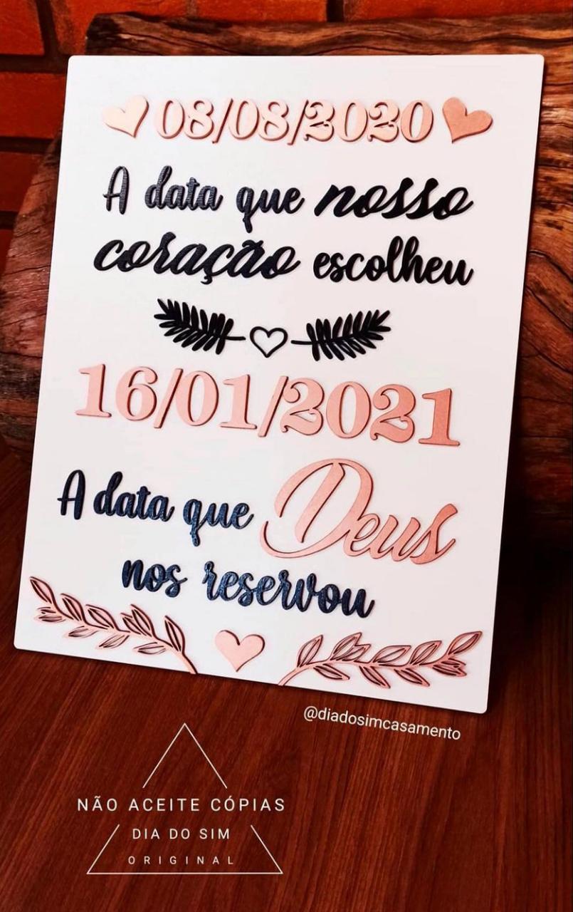 No final de 2019 inciou a pandemia, e sem dúvida foi motivo de muita preocupação e aflicação em todos os sentidos, em nosso setor, quase 100% dos casamentos sendo remarcados e pensamos dia e noite em como criar algo que pudesse trazer um certo conforto para esse momento de crise. Adiar um sonho não é o plano ideal e nossos casais estavam super chateados. Foi aí que surgiu mais um produto ORIGINAL DIA DO SIM, a Placa ALTERAÇÃO DE DATAS.
